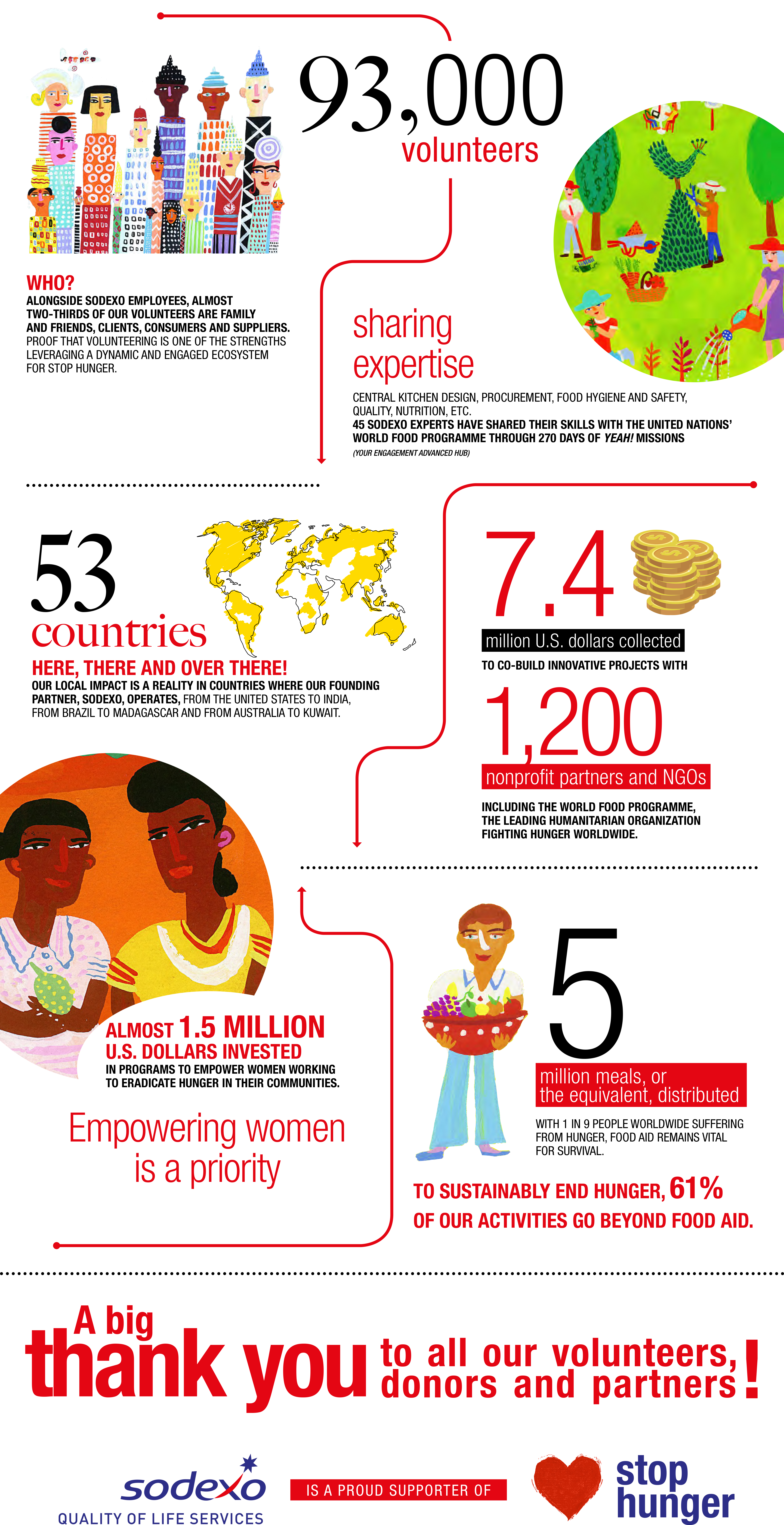 Un immense et sincère MERCI à chacun des employés Sodexo , capables de mobiliser d’autres bénévoles à leurs côtés pour soutenir Stop Hunger , contribuant à éradiquer la faim localement et dans le monde entier.